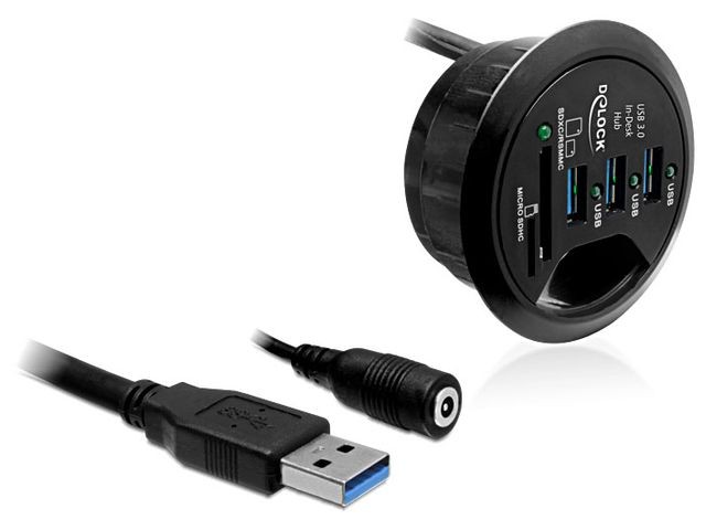 Ten hub Delock można zainstalować w wycięciu biurka i jednocześnie wyprowadzić kable monitora, klawiatury i myszy. Jest to rozwiązanie praktyczne i oszczędzające miejsce, co pozwala na łatwe podłączanie urządzeń USB. Kartę SD można łatwo podłączyć do istniejących gniazd huba biurkowego w celu łatwego czytania i pisania.