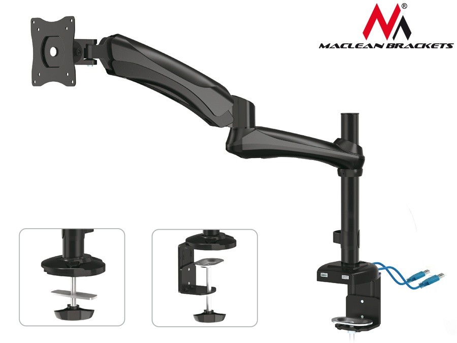 Uchwyt do monitora czarny Maclean MC-669B ze sprężyną podwójne ramię 13"-27" 9 kg + USB 3.0