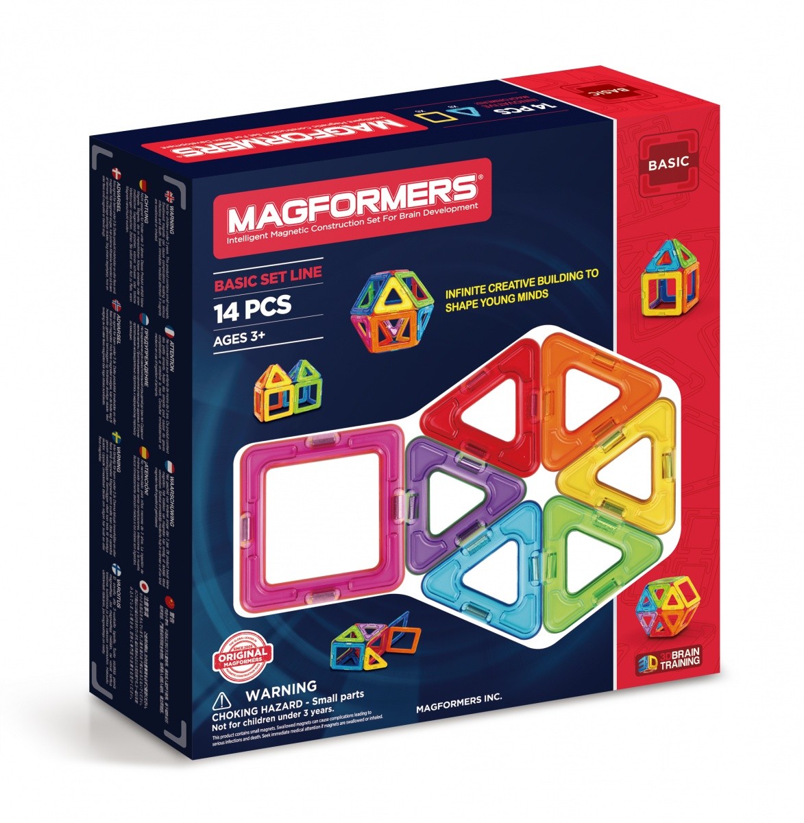 MAGFORMERS BASIC 14 to klocki z wbudowanymi silnymi magnesami neodymowymi, które zawsze się przyciągają. Wystarczy zbliżyć do siebie ściankami dwa klocki, a one natychmiast ze sobą się połączą. Za pomocą klocków wzorowanych na kształt figur geometrycznych można zbudować wspaniałe trójwymiarowe budowle. W zabawie można korzystać z dołączonej do zestawu instrukcji lub innych przykładów zamieszczonych na stronie magformersworld.com lub własnej wyobraźni.