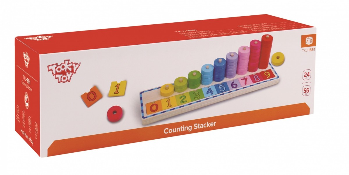 Zabawa polega na dopasowaniu ilości nałożonych kółek do cyferek namalowanych na podstawce. Zadanie ułatwiają identyczne kolory kółek i cyferek. Kolorowe kółeczka do nakładania pomagają w łatwy sposób opanować podstawy liczenia. Podczas zabawy dziecko ćwiczy zdolności manualne, rozwija umiejętności logicznego myślenia, koordynację ręka oko, uczy rozpoznawania kolorów oraz pojęcia większy mniejszy.