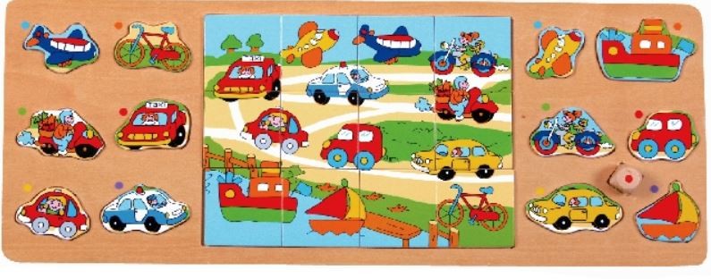 - Zabawka zawiera 24 elementów - umieszczonych na drewnianej podkładce: 12 kwadratowych puzzli, 11 puzzli o różnych kształtach z grafikami o tematyce związanej z pojazdami, kostkę do gry, zasady gry umieszczone na opakowaniu.