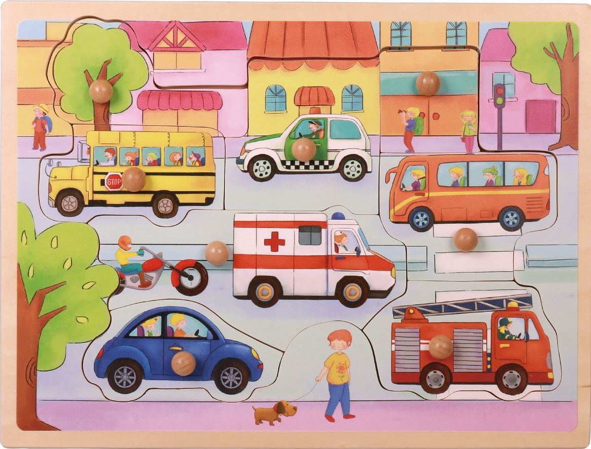 - Drewniana układanka z pinezkami z motywem samochodów i ruchu ulicznego firmy TOP BRIGHT.