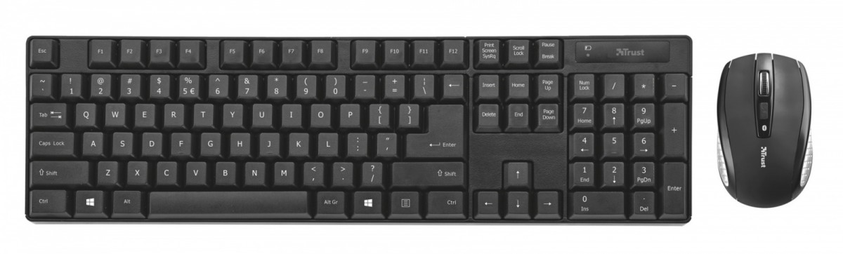 Bezprzewodowa klawiatura z pełnowymiarowymi klawiszami i kompaktowa mysz.