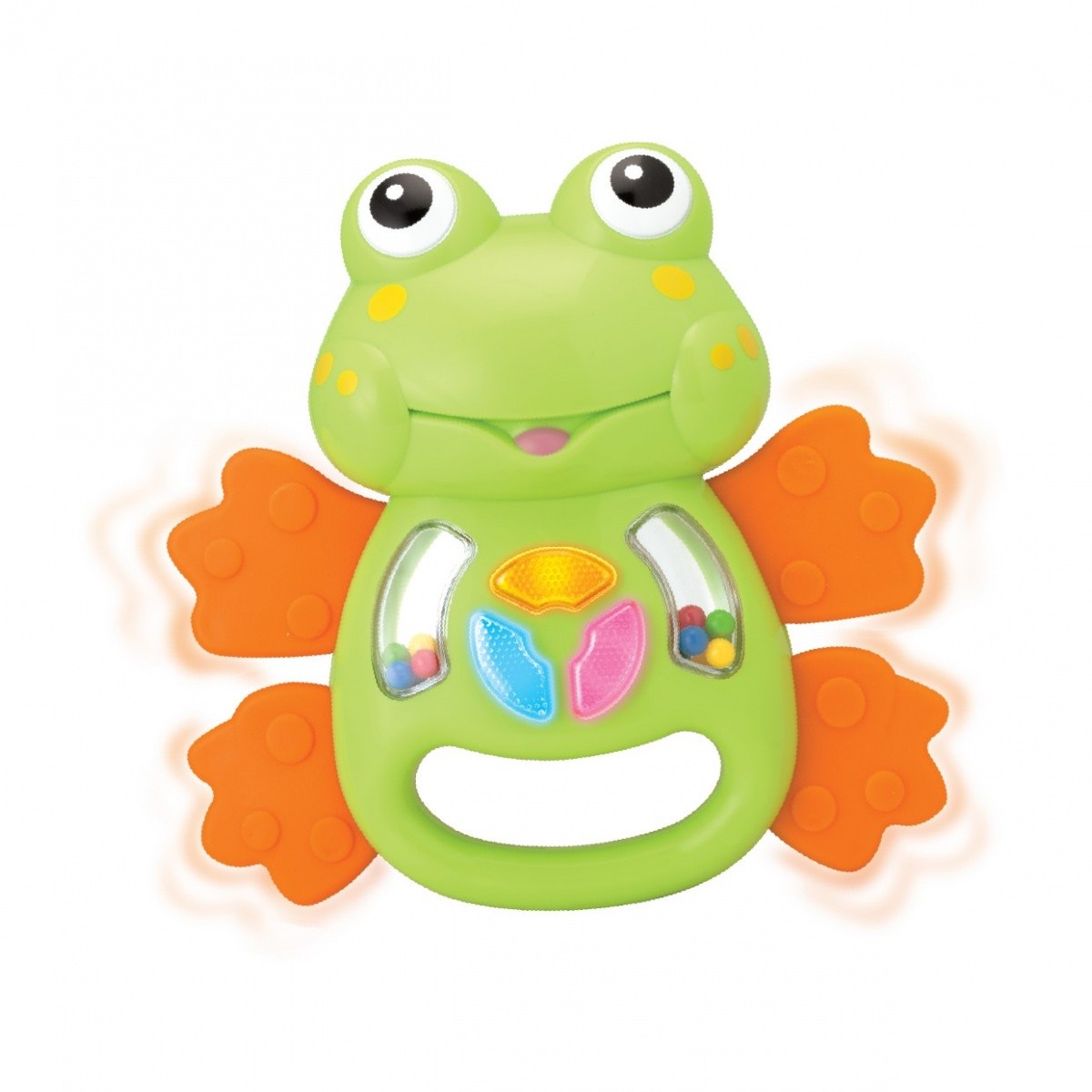 Wielofunkcyjna zabawka dla najmłodszych. Jako gryzaczek ulży swędzącym ząbkom, dzięki małym wypustkom, które masują dziąsła dziecka. Jako grzechotka, wypełniona kolorowymi kuleczkami, rozbawi każde dziecko. Dodatkowo Żabka Śmieszka ma na sobie kolorowe klawisze, które po naciśnięciu załączą melodyjki i dźwięki przyjemne dla ucha każdego szkraba. Migoczące przy tym światełka dodatkowo wzbudzą ich zainteresowanie. Zabawka wspiera koordynację ruchowo-słuchową, a także wzrokowo-ruchową. Praktyczny uchwyt ułatwi bobasowi trzymanie oraz grzechotanie żabką.