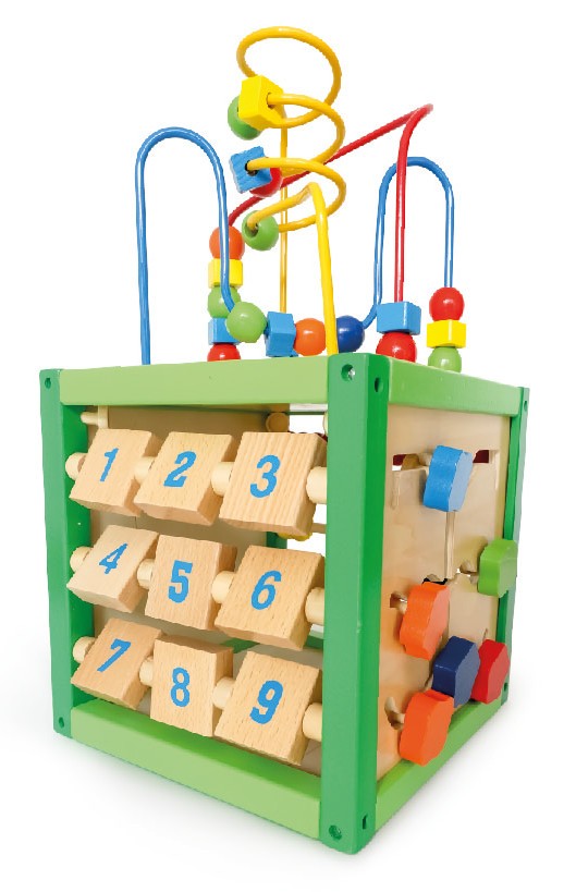 - Pudełka w którym każda ze ścian kryje nową, wciągającą zabawkę: labirynt, liczydło, tablicę, obrotowe klocki z cyferkami i rysunkami zwierząt