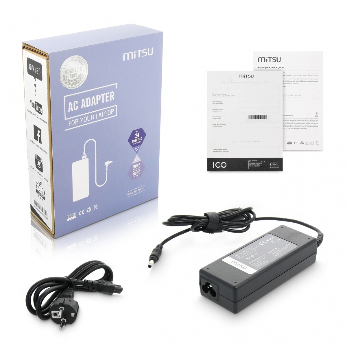 Nowy zasilacz do laptopa HP Compaq marki Mitsu wyposażony został w filtr ferrytowy oraz w doskonałe zabezpieczenia chroniące przed przepięciem, przegrzaniem, przeciążeniem i przeładowaniem. Ładowarki do laptopów HP Compaq skierowane są do najbardziej wymagających użytkowników, ceniących sobie bezstresową i komfortową pracę. O jakości produktu świadczą uzyskane certyfikaty: CE, ROHS, FCC oraz ścisła kontrola jakości eliminująca powstanie ewentualnych defektów.