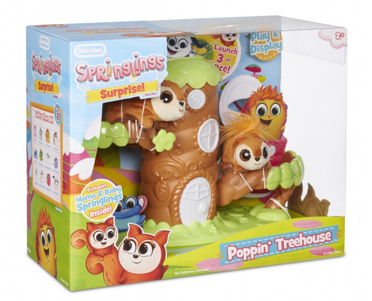 Springlings Surprise to wesołe, sprężynujące zwierzątka, które uwielbiają zabawę w skakanie. Domek na drzewie to fantastyczny zestaw do zabawy Sprężypluszakami. Wystarczy włożyć do domku dwa lub trzy zwierzątka, unieść dach i wystrzelić jednocześnie całą paczkę sprężynujących kumpli! W zestawie znajdują się 2 zwierzaki - mama i bobas wiewiórka. Istnieje możliwość umieszczenia w domku na drzewie Sprężydomku ze sprzedawanych oddzielnie zestawów.