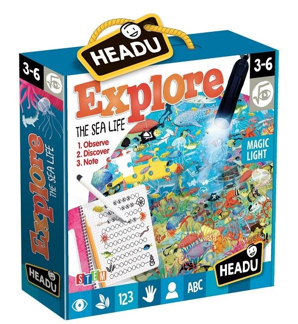 Ułóż puzzle, a następnie dokładnie obserwuj ilustrację i odkryj przedmioty znajdujące się w morzu. Za pomocą specjalnej latarki zobaczysz niewidoczne gołym okiem elementy. Odnotuj swoje odkrycia w notesie.