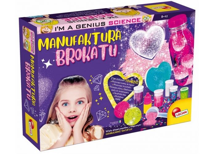 Manufaktura Brokatu to nowa odsłona serii Im a genius skierowanej dla dziewczynek. Poza bogatym zestawem materiałów do wykonywania eksperymentów, w opakowaniu znajduje się także ilustrowany podręcznik wprowadzający dzieci w teoretyczne zagadnienia. Wszystkie eksperymenty uszeregowane są według rosnącego stopnia trudności, tak by dziecko stopniowo mogło poznawać dane zagadnienie i rozwijać swoją wiedzę, poznając zarówno teoretyczne, jak i praktyczne aspekty danej dziedziny. Dzięki Manufakturze Brokatu można wykonać kryształowe kule do kąpieli, brokatowe serduszka, a nawet brokatową świecącą lampkę!