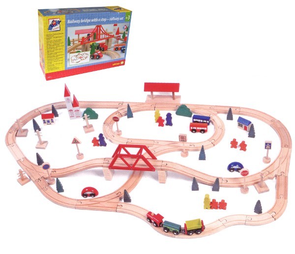 Zestaw kolajka składa się z całego miasteczka kolejowego: pociągu z lokomotywą i dwoma wagonikami, torów, mostu, przystanku, autek i znaków drogowych, domków, ludzików i drzewek. Rozbudowany zestaw i kreatywna zabawa dla całej rodziny.