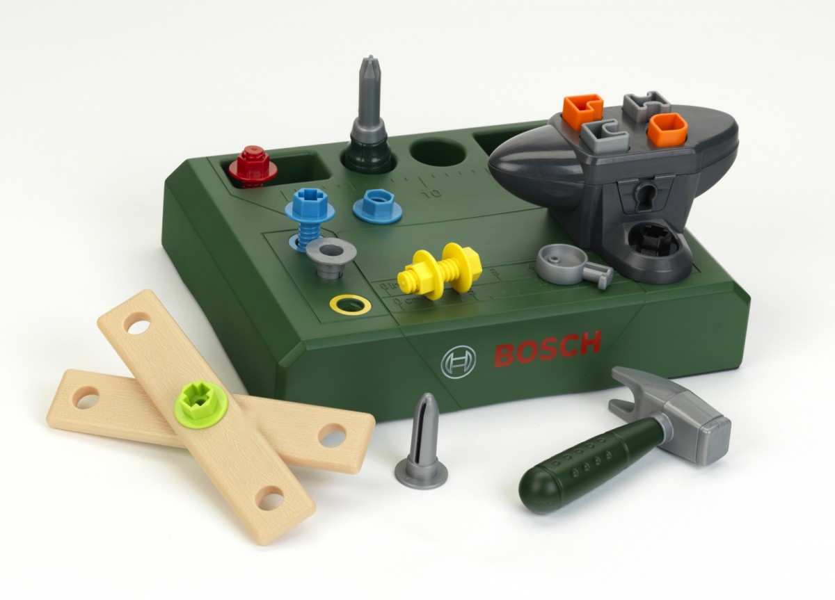 Mój pierwszy warsztat to propozycja doskonała dla najmłodszych amatorów prac warsztatowych. W skład zestawu wchodzi młotek, śrubokręt krzyżakowy, zamykane na kluczyk imadło-sorter z czterema kształtami do wrzucania oraz zestaw śrub, nakrętek i klapek do skręcania. Zestaw umożliwia maluchom kreatywną zabawę i doskonalenie umiejętności manualnych. Dzięki wysokiej jakości wykonania wszystkie śruby wkręca się z dużą łatwością, podobnie łatwe jest otwieranie i zamykanie imadła-sortera. Wbijanie niektórych elementów warsztatu powoduje wyskakiwanie innych, co sprawia dzieciom dużą frajdę. Imadło można oczywiście przykręcać i odkręcać od płyty warsztatu.