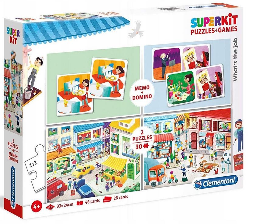 Strona główna Gry/Puzzle gry Zestaw Superkit Whats the job 2x30 elementów + MEMO + DOMINO Cena Netto: 21,29 zł. error_outline Produkt chwilowo niedostępny. Opis Super Kit - What's the jobPomaga rozwijać pamięć, zdolności manualne i spostrzegawczość.Zawiera karty Memo, Domino i 2 plansze puzzli, każda po 30 elementów.