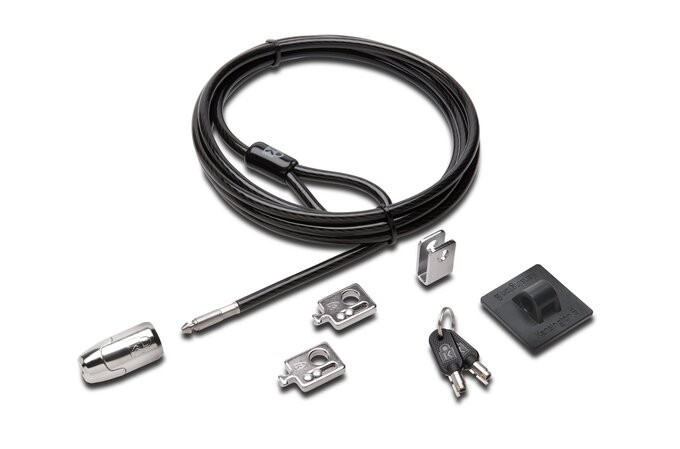 - Stalowa linka wzmacniana włóknami węglowymi (o dł. 2,4 m) jest odporna na przecięcie i można ją przymocować do biurka, stołu lub innej powierzchni