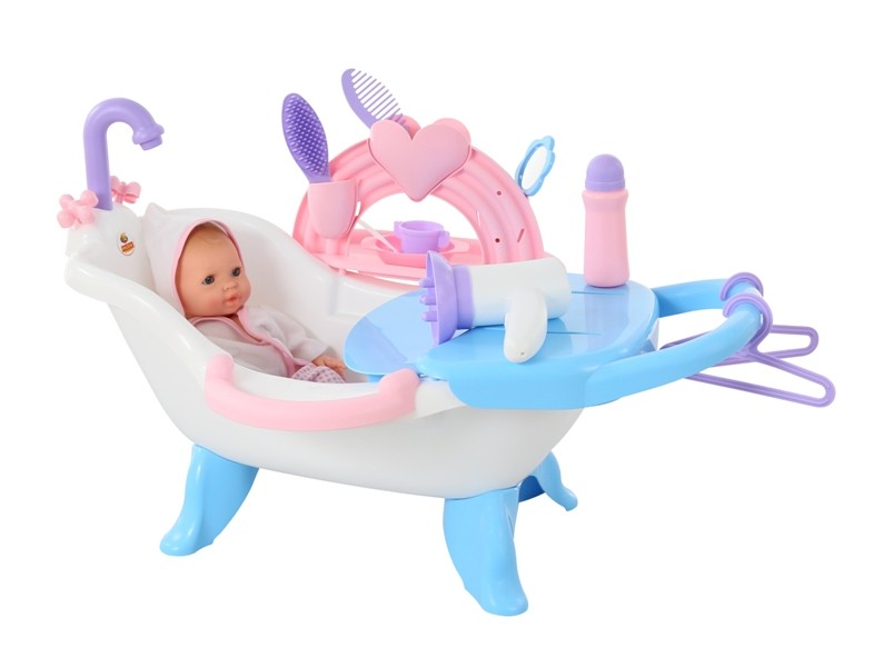 "Małe dziewczynki uwielbiają opiekować się swoimi lalkami. Przebierają je, karmią i myją. Robią wszystko, czego wymaga opieka nad prawdziwym niemowlęciem. ZESTAW DO KĄPANIA LELEK NR 1 Z AKCESORIAMI I LALKĄ od firmy POLESIE COLOMA pozwoli im sprawdzić się w roli małych mam. Zestaw to przede wszystkim wanienka na czterech dużych nogach wyposażona w kran z dwoma pokrętłami oraz uchwyt umożliwiający jej przenoszenie. Z boku wanienki umieszczono półkę z pałąkiem, na której można postawić miseczkę z jedzeniem albo butelkę z piciem. Na pałąku znajdują się specjalne kieszonki do przechowywania zawartych w zestawie: suszarki, lusterka, grzebienia oraz szczotki. Do zestawu dołączono również nakładkę, którą można umieścić na wannie. Posłużyć może jako stolik do karmienia bądź zabawy podczas kąpieli. Jest również uchwyt, na którym można powiesić załączone dwa wieszaki. Oprócz wcześniej wymienionych w zestawie znajdziemy również takie akcesoria jak: miseczka, łyżeczka, butelka do karmienia, kubeczek, lalka a także ubranko dla lalki (szlafroczek). Produkt wykonany jest z wysokiej jakości materiałów, co gwarantuje trwałość oraz bezpieczeństwo podczas użytkowania."