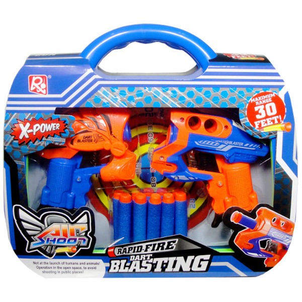 Każdy w innym kolorze do zabawy dla Twojego dziecka oraz jego przyjaciela. W ten sposób dzieci będą mogły bawić się jednocześnie. W zestawie oprócz dwóch pistoletów znajduje się również 10 strzałek i tarcza. Zabawka zapakowana w gustowną walizkę.