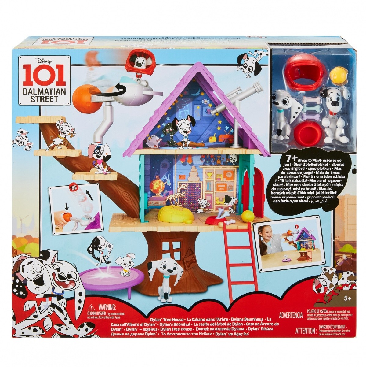 Każdy psi dzień jest pełen przygód na Ulicy Dalmatyńczyków 101! Wielopoziomowy domek o wysokości ok. 39 cm ma ponad 5 miejsc do zabawy oraz wyjątkowe akcesoria, które rozwijają kreatywność i nie pozwalają na nudę! Dzięki ciekawym elementom - takim jak schody zmieniające się w zjeżdżalnię i tajemnicza zapadnia - fani serialu mogą odtwarzać przygody z Ulicy Dalmatyńczyków 101 lub tworzyć własne historyjki. Dzieci z zachwytem wyruszą na podbój kosmosu z Dylanem, jego teleskopem i ministatkiem kosmicznym! Umieść pieska w rakiecie, zakręć, a następnie naciśnij przycisk i wystrzel figurkę tak, by przeleciała nad dachem! Jeśli lubisz wzbijać się w powietrze, pozwól Dolly "poskakać" na trampolinie. Akcesoria - takie jak poducha, hełm astronauty, kości i wiele innych - zwiększają radość z zabawy. Kolory i elementy dekoracyjne mogą się różnić.