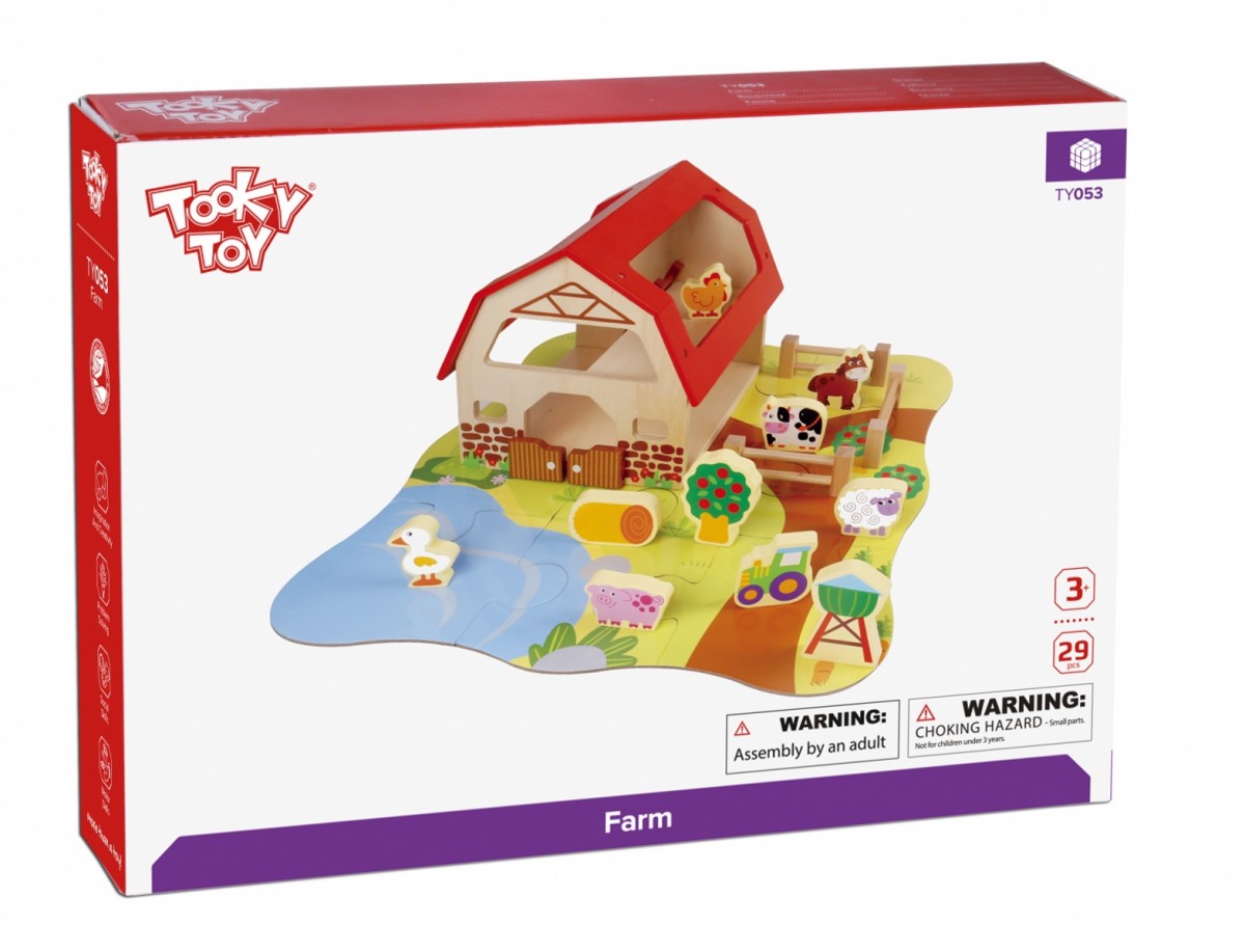 W skład zestawu wchodzą drewniana stodoła, zagroda, figurki związane z życiem na farmie oraz 9 puzzli, które po ułożeniu stanowią podstawę.