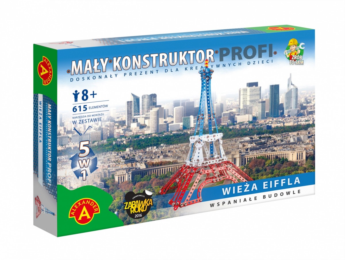 Wyjątkowy zestaw konstrukcyjny składający się 615 elementów w postaci kolorowych blaszek, śrubek, nasadek, elementów z tworzywa typu koła. Dzięki zawartym w zestawie narzędziom można samodzielnie zbudować Wieżę Eiffla oraz 4 inne maszyny: dźwig mobilny, żuraw portowy, kosmiczny myśliwiec i wyścigówkę.