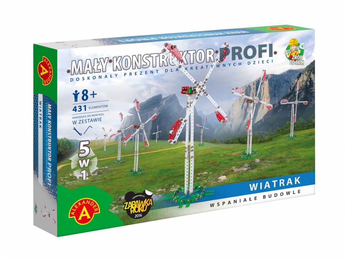 Wyjątkowy zestaw konstrukcyjny składający się 431 elementów w postaci kolorowych blaszek, śrubek, nasadek, elementów z tworzywa typu koła. Dzięki zawartym w zestawie narzędziom można samodzielnie zbudować wiatrak oraz 4 inne maszyny: żuraw portowy, samolot, czołg i wyścigówkę. Model po złożeniu jest trwałay i swobodnie może służyć do dalszej zabawy. To idealny wstęp do rozbudzenia w dziecku pasji inżyniera. Zabawka która łączy pokolenia, zachęcając do wspólnego majsterkowania.