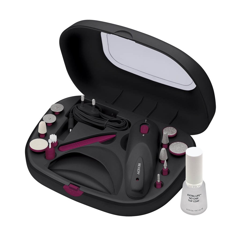 Frezarka Revlon Style&Dry to kompletny, trzynastoelementowy zestaw, który pozwala na wykonywanie perfekcyjnego manicure i pedicure w domowym zaciszu. Zintegrowana suszarka zapewnia bardzo krótki czas schnięcia. Dołączony Top Coat daje efekt błyszczących paznokci oraz zapobiega odpryskiwaniu lakieru.