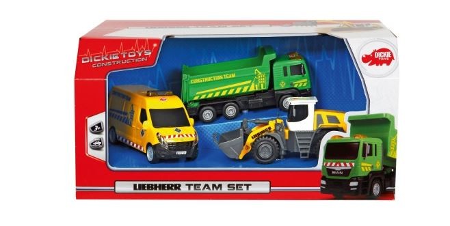 Zestaw trzech pojazdów budowlanych bez napędu: wywrotka MAN, Van Renault, ładowarka Liebherr L586 lub koparka Liebherr R936, ruchome elementy, 18 cm, 3 l+