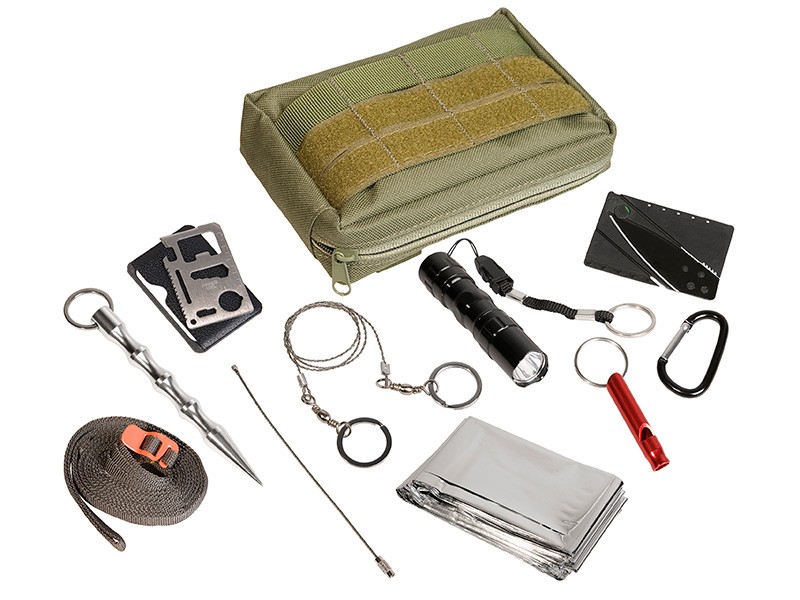 RESCUE KIT (KOMPLET RATUNKOWY - koc aluminiowy, gwizdek ratunkowy, piła w łańcuchu, nóż karty kredytowej, wodoszczelne światło błyskowe, wnyki).
