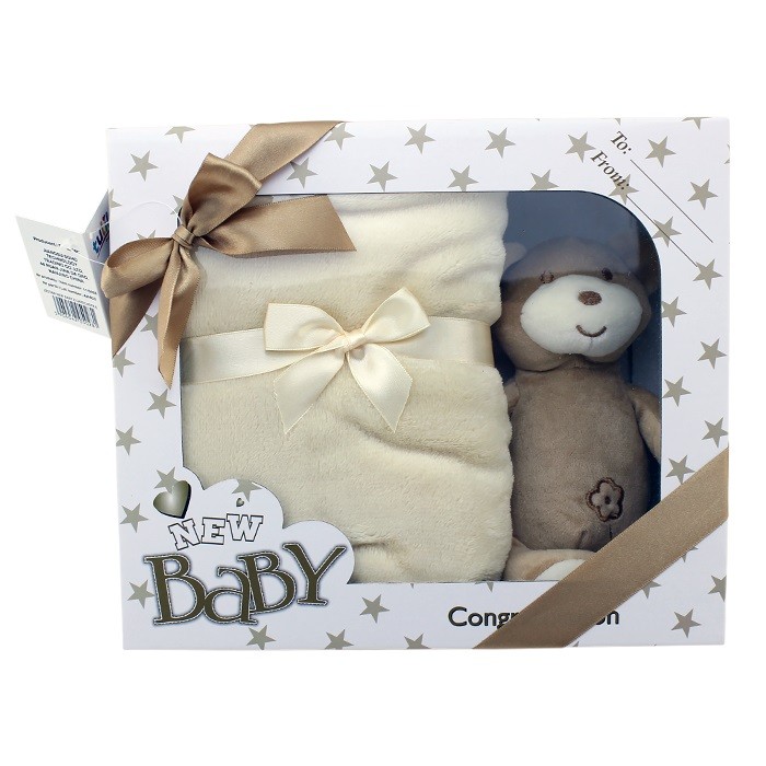 Zestaw Karmelowy New Baby to prześliczny prezent dla nowo narodzonego maluszka, Miś - przytulanka oraz kocyk są wykonane z wyjątkowo mięciutkiego i milutkiego w dotyku materiału a do tego całość jest zapakowana w eleganckie pudełko.