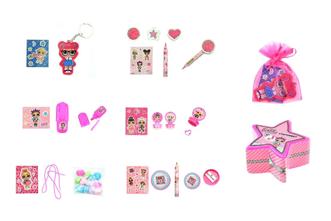 Prawdziwa gratka dla każdej fanki laleczek L.O.L. W różowym pudełku w kształcie gwiazdki kryje się zestaw artykułów szkolnych ozdobionych motywem laleczek. Zapakowany dodatkowo w elegancki woreczek. Co znajdziesz w środku? To niespodzianka. Może notesik i brelok do kluczy? Albo kredki i gumki do mazania? Aż 6 możliwości! Zbierz je wszystkie! Kolekcjonuj i wymieniaj się z koleżankami. Zestawy sprzedawane w displayach ladowych.