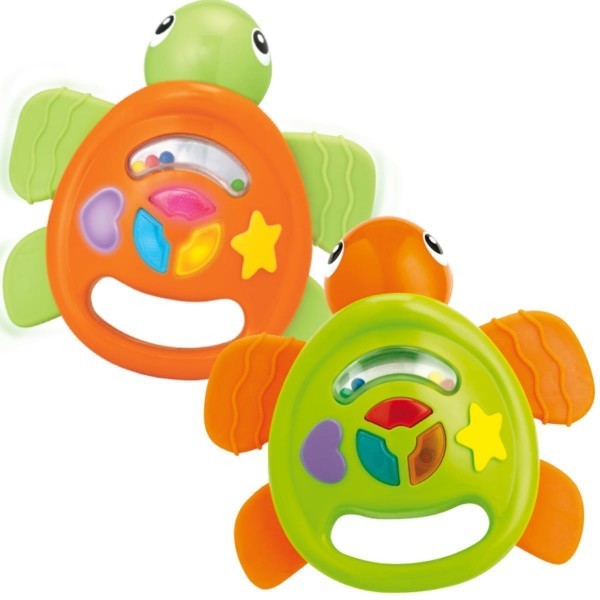 Kolorowa grzechotka to wielofunkcyjna zabawka, która pełni rolę zarówno grzechotki, gryzaka oraz interaktywnej zabawki. Na brzuszku Żółwia Maciusia znajduje się grzechotka z kolorowymi koralikami, serduszko, gwiazdeczka oraz 3 świecące przyciski. Po przyciśnięciu, żółw wygrywa jedną z trzech "wesołych" melodii, której towarzyszą efekty świetlne (kolorowe, świecące na niebiesko, czerwono i żółto światełka). 4 miękkie łapki, pełnią rolę gryzaków.