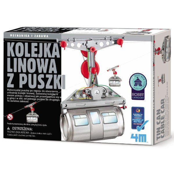 Wykorzystaj puszkę po napoju do stworzenia unikalnej kolejki linowej. Zainstaluj kolejkę w swoim pokoju i obserwuj jak przemieszcza się w górę i w dół, od jednego punktu do drugiego. Teraz możesz stworzyć własną kolejkę linową, z wagonikiem lub gondolą dla narciarzy, na wzór prawdziwej kolei linowej, jaką można wjechać na Kasprowy Wierch. ZAWARTOŚĆ:część jezdna, wał cofania, 2 odbojniki (4 części), duże koło pasowe, średnie koło pasowe, osłona silnika, duża blokada koła, koło pasowe silnika, pokrywa silnika, silnik, 2 boczne blokady koła, 2 boczne koła, obrotowa zatyczka łącząca, 4 zatyczki do przewodów, 4 śruby, oś puszki, osłona baterii, linka, 2 opaski elastyczne, naklejki na puszkę.Do prawidłowego funkcjonowania kolejki potrzebne są 2 baterie AA 1,5 V. Potrzebny będzie również mały śrubokręt krzyżakowy i aluminiowa puszka po napoju.