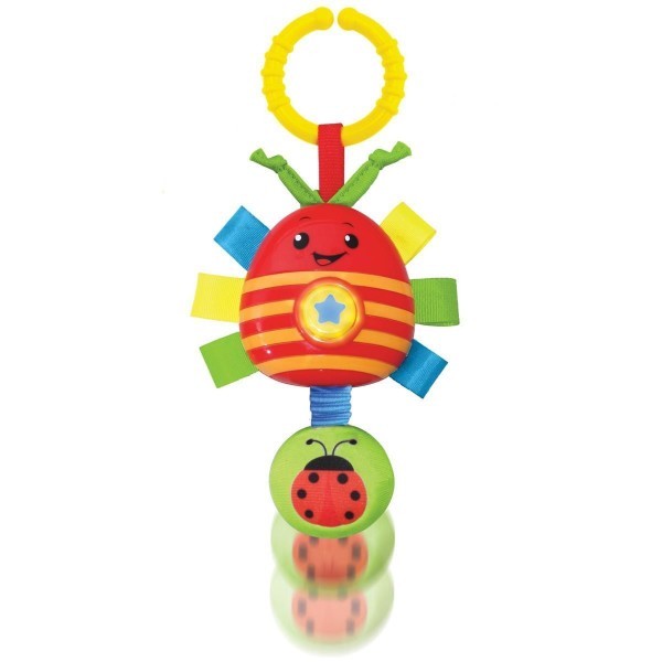 Biedronka ma duży uchwyt mocujący służący do zwieszenia zabawki. Na brzuszku zabawki znajduje się przycisk z nutką, który uruchamia tryb zabawy. Uruchomiony przycisk mruga światełkiem, motylek zaś wypowiada grzecznościowe powiedzonka. Miękki ogonek zabawki można pociągnąć, wywoła to wibrację, które będą stymulować zmysły dziecka. Przyczepione do główki miękkie troczki można ssać.