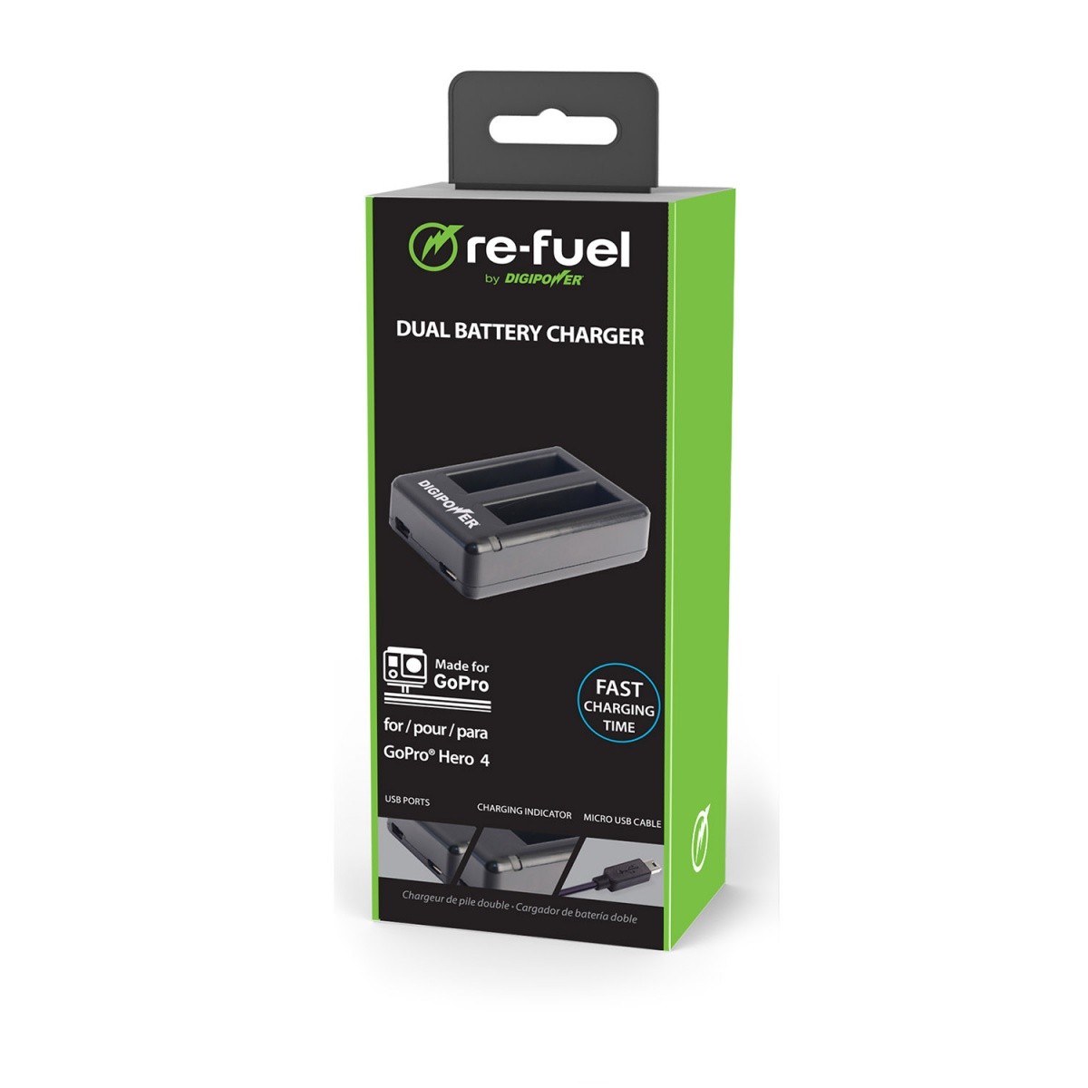 Re -Fuel Hero 4 Podwójna ładowarka zapewni bezproblemowe działanie Twojego sprzętu GoPro przez cały dzień. Urządzenie zapewnia szybkie ładowanie dwóch baterii modelu Hero 4. Do zestawu dołączono kabel ładujący micro USB.