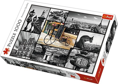Puzzle - kolaż 1000 elementów przypominające pocztówkę z Paryża. Po ułożeniu powstanie obrazek o wymiarach 68 x 48 cm. Wysoką jakość, nasycenie kolorów i bezpieczeństwo układania zapewnia kalandrowany papier odbijający światło i wykorzystanie materiałów ekologicznych.