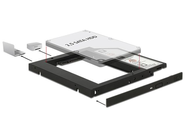 Wąską ramkę montażową firmy Delock można zainstalować w wąskim gnieździe SATA 5.25” cala w celu obsługi dysku twardego SATA 2.5” cala.