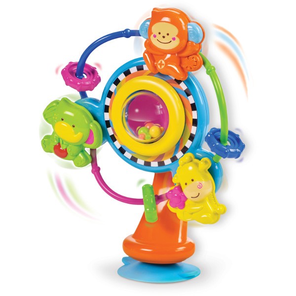 W trakcie obracania, słoń, małpka i żyrafa także się obracają, wesoło grzechocząc. W centrum młyna znajduje się grzechotka z kulkami. Zabawka wyposażona w przyssawkę umożliwiającą umocowanie do blatu.