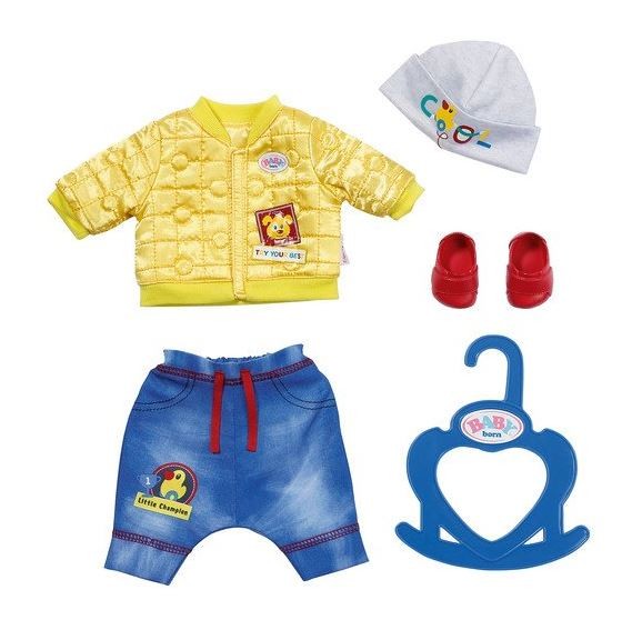 Jasnożółta kurtka z geometrycznymi łatami połączona jest z jeansami o stylowych czerwonych szwach. BABY born Little ma również na sobie szary kapelusz z kapitalnym nadrukiem i czerwone buty. Strój można łatwo założyć i zdjąć.