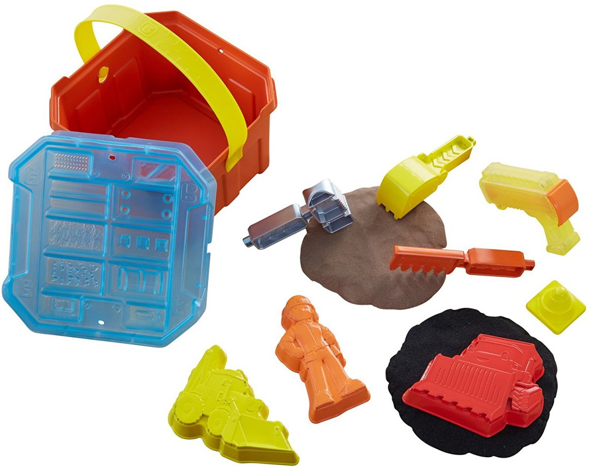 Piasek kinetyczny w dwóch kolorach (141 g każdy) sprawi, że dzieci poczują się, jakby naprawdę odciskały cegły i kładły asfalt. Maluchy mają również do dyspozycji szczegółowe foremki postaci Bob Budowniczy, Koparka i Spychacz! Wiaderko budowniczego zawiera także cztery narzędzia do odciskania, w tym przydatny wyciskacz zamieniający piasek kinetyczny w klocki, przy pomocy których dzieciaki mogą budować, burzyć i budować na nowo. Samo Wiaderko budowniczego to wielofunkcyjne naczynie, którego zdejmowana pokrywa zawiera 10 form o tematyce budowlanej. Wiaderko jest również wyposażone w uchwyt, dzięki któremu mali budowniczy mogą zabrać narzędzia oraz piasek kinetyczny ze sobą i bawić się poza domem!