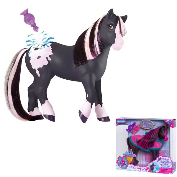 Jasmine mówi: prawdziwe piękno jest w środku, ale sama uwielbia wyglądać pięknie i łazienka jest jednym z jej ulubionych miejsc, by się wystylizować! Jasmine, piękna Appaloosa, po zabawie na padoku jest już gotowa do kąpieli! Zaskoczenie ! Po umieszczeniu jej w wodzie, wszystkie jej różowe miejsca zmieniają się na biały kolor! Kiedy wyschnie, białe miejsca na ciele zmieniają się ponownie na różowe. Jasmine kocha swoje różowe papućki, różowy ręczniczek z miętowym monogramem i różowy grzebień do pielęgnacji jej pięknej grzywy i ogona, Zestaw zawiera: konia Appolosa Jasmine zmieniającego kolor (20x7x19,5cm), papućki różowe, różowy atomizer, ręczniczek kąpielowy z miętowym monogramem, szczotkę do pielęgnacji. Dla dzieci powyżej 3 roku życia.