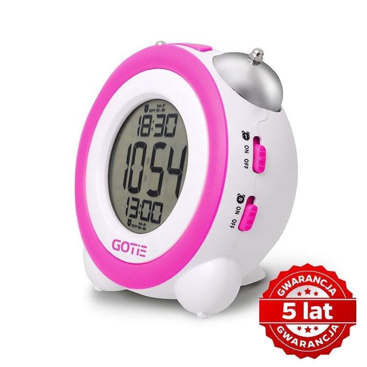 Badania wykazują, że dzieci poddawane na co dzień dużej ilości dźwięków elektronicznych pochodzących z urządzeń takich jak telefony komórkowe, smartfony czy tablety stają się mniej wrażliwe na syntetyczne dźwięki. Powoduje to, że często nie reagują na budziki w tonach generowanych przez urządzenia elektroniczne. Budzik GOTIE WAKEUP CLOCK łączy nowoczesny zegar elektroniczny o dużym i wyraźnym wyświetlaczu LCD z tradycyjnym brzmieniem dzwonka mechanicznego, który dobudzi nawet największego śpiocha. Jakość wykonania i dostępność w sześciu różnych kolorach zadowolą każdego. Kolor podświetlenia wyświetlacza jest zawsze dopasowany do koloru ramki i przycisków. Budzik GOTIE WAKEUP CLOCK będzie wspaniałym prezentem dla każdego ucznia na pierwszy dzień szkoły!