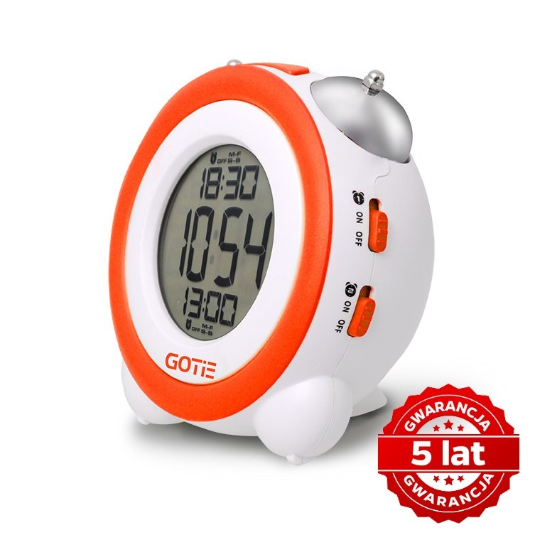 Badania wykazują, że dzieci poddawane na co dzień dużej ilości dźwięków elektronicznych pochodzących z urządzeń takich jak telefony komórkowe, smartfony czy tablety stają się mniej wrażliwe na syntetyczne dźwięki. Powoduje to, że często nie reagują na budziki w tonach generowanych przez urządzenia elektroniczne. Budzik GOTIE WAKEUP CLOCK łączy nowoczesny zegar elektroniczny o dużym i wyraźnym wyświetlaczu LCD z tradycyjnym brzmieniem dzwonka mechanicznego, który dobudzi nawet największego śpiocha. Jakość wykonania i dostępność w sześciu różnych kolorach zadowolą każdego. Kolor podświetlenia wyświetlacza jest zawsze dopasowany do koloru ramki i przycisków. Budzik GOTIE WAKEUP CLOCK będzie wspaniałym prezentem dla każdego ucznia na pierwszy dzień szkoły!