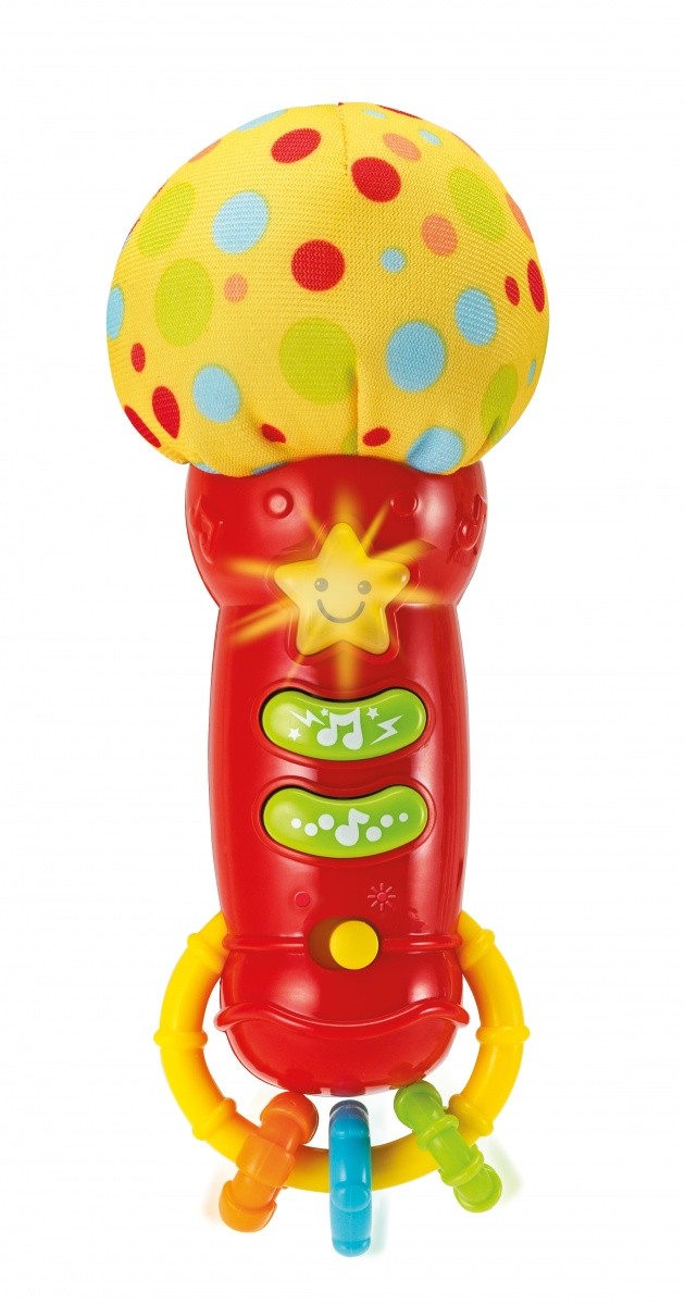 Mikrofon jest zabawką dla najmłodszych. Dedykowany maluchom, które są w wieku powyżej 3 miesięcy. Na uchwycie usytuowane są trzy przyciski funkcyjne oraz włącznik. Naciśniecie uruchamia wesołe dźwięki. Przycisk w kształcie gwiazdki wesoło mruga w rytm wygrywanych melodii. Górna część mikrofonu wykonana jest z miękkiego materiału dzięki czemu jest w pełni bezpieczne dla dziecka. Zabawka może pełnić również funkcję gryzaczka. Przyjemne, żywe kolory przyciągną uwagę każdego maluszka zachęcając do zabawy.