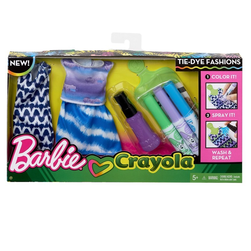 Każdy zestaw zawiera trzy zmywalne ubranka (spódniczkę, top i sukienkę) w unikalnych kolorach i z rozmytymi motywami, trzy flamastry Crayola, butelkę ze spryskiwaczem i formę do sukienki; lalka nie znajduje się w zestawie. Kolory i elementy dekoracyjne mogą się różnić.