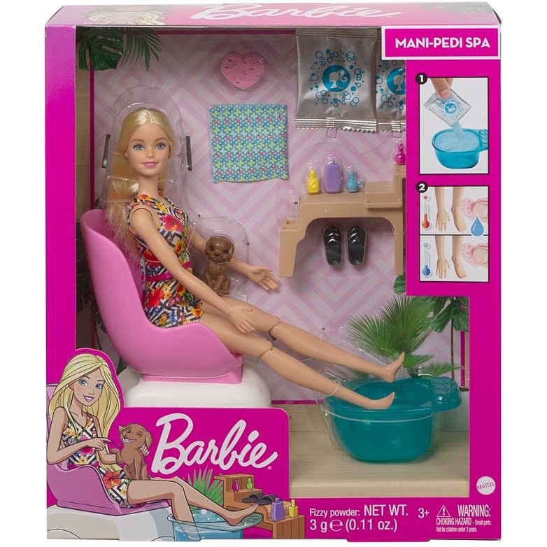 BarbieMani-Pedi Spa zestaw do zabawy Barbie zachęca do dbania o własne dobre samopoczucie z tym zestawem do zabawy zawierającym lalkę, szczeniaczka i spa dla paznokci. Dokonaj magicznej zmiany koloru zabawa jest tak prosta! Posadź lalkę Barbie na fotelu (kolana lalki się zginają) i włóż jej stopy do miski. Wypełnij miskę wodą i dodaj jedną z dwóch dołączonych saszetek z proszkiem, który spieni wodę jak w prawdziwym spa. Wytrzyj stopy lalki ręcznikiem, a potem użyj gąbki i wody, aby zmienić kolor jej paznokci u rąk i nóg! Na drewnianej ławce z półką można ułożyć akcesoria pozwalające zrobić manicure i pedicure. Jest tam też miejsce dla szczeniaczka. Lalka Barbie jest ubrana w kolorowy strój i klapki.