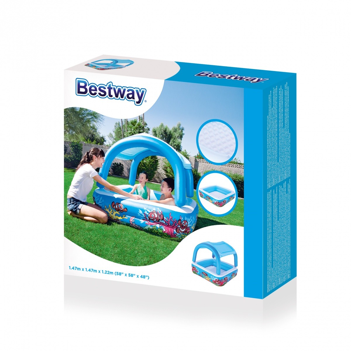 Basen z daszkiem rafa koralowa to produkcja firmy Bestway. Przeznaczony jest dla małych miłośników letnich kąpieli, stwarza możliwość fantastycznego spędzenia czasu podczas upalnych dni a doczepiana za pomocą nap parasolka zapewnia bezpieczne schronienie. Basen jest świetnie przystosowany dla maluchów - wygodna, miękka, dmuchana podłoga oraz wesoły wizerunek zachęci każdego by zostać tam na dłużej.