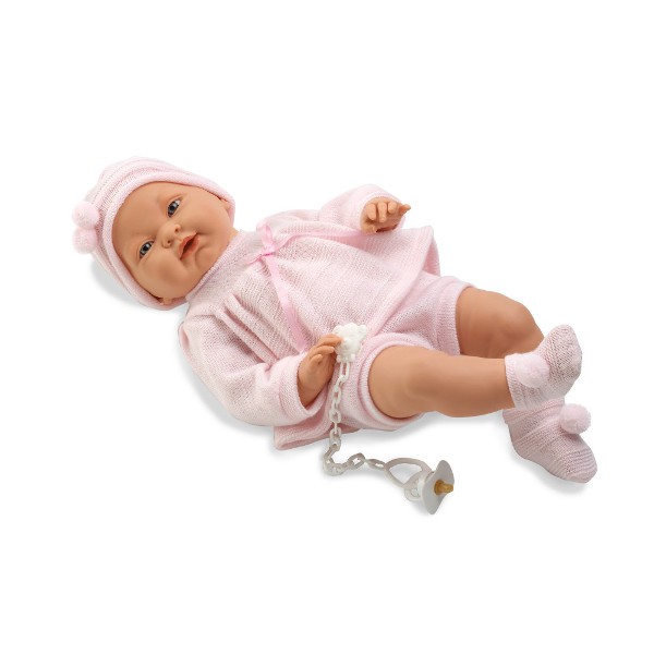 Zrobiona jest w mięciutkiego w dotyku winylu i nadaje się do kąpieli. Ubrana została w uroczy komplecik- różową, ciepłą piżamkę, czapeczkę oraz skarpetki z pomponikami. W zestawie dołączony jest smoczek.