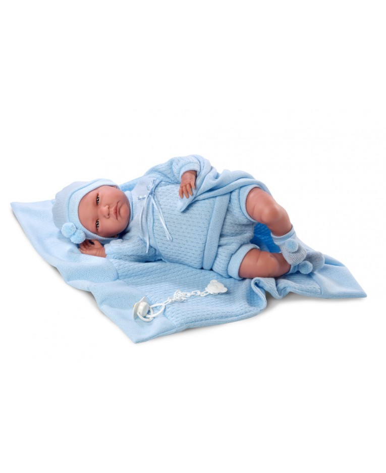 Jej brzuszek wypełniony jest mięciutką wyściółką. Rączki, nóżki, buzia zrobione zostały z przyjemnego w dotyku winylu. Nasz noworodek ubrany jest w niebieską piżmakę, czapeczkę i skarpetki z pomponikami. W komplecie dołączony jest mięciutki kocyk i smoczek. Lalka naciśnięta na brzuszek zapłacze, a potem powie "Mama, Papa".