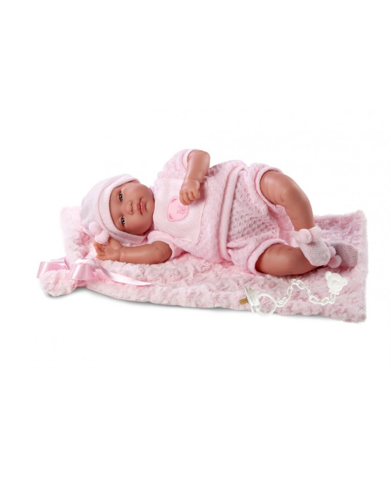 Jej brzuszek wypełniony jest mięciutką wyściółką. Rączki, nóżki, buzia zrobione zostały z przyjemnego w dotyku winylu. Nasz noworodek ubrany jest w różową, ciepłą piżamkę oraz czapeczkę z pomponikami. Lalka naciśnięta na brzuszek zapłacze, a potem powie "Mama, Papa". Zestaw zawiera również smoczek oraz bardzo mięciutki i przyjemny w dotyku kocyk.