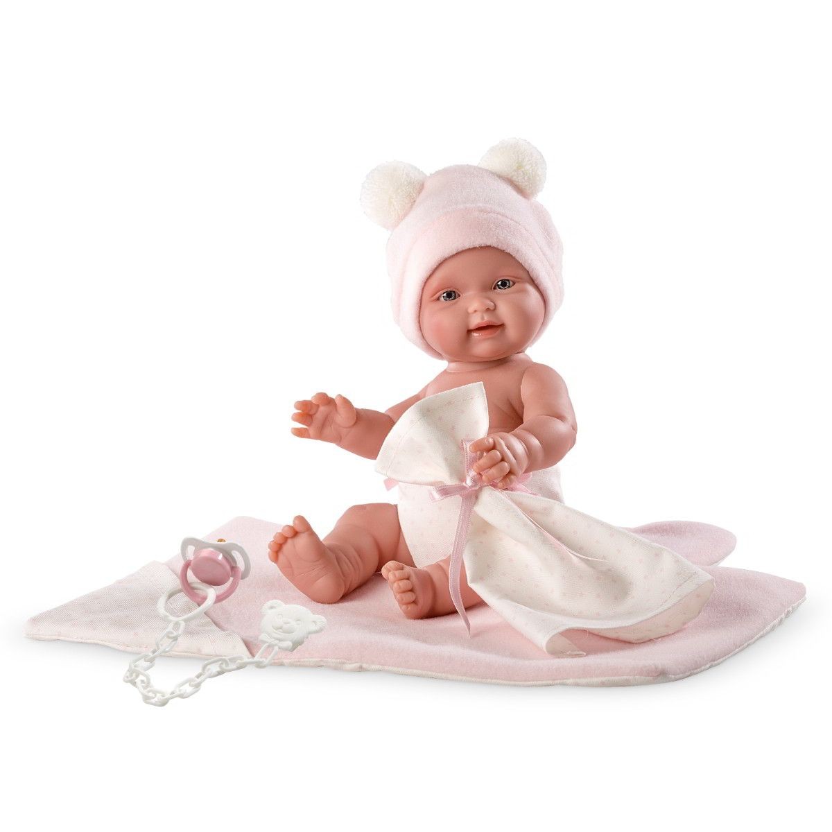 Do lalki dołączony jest mięciutki różowy kocyk, ozdobny smoczek oraz biała chustka.