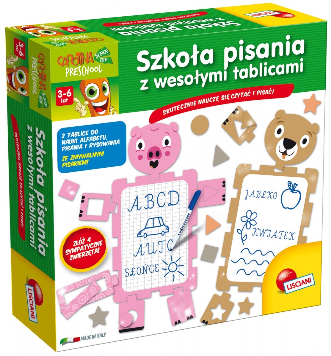 Gra zawiera dwie dwustronne tablice, na których dzieci mogą uczyć się pisania, rysowania i czytania.