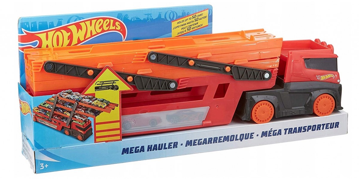 Mega Transporter Hot Wheels to wielka ciężarówka, która pozwoli Ci bawić się na różne sposoby i przeżywać odjazdowe przygody. Pojazd posiada też specjalne grafiki z okazji 50-lecia marki! Ten wielki transporter pomieści na swoich sześciu rozkładanych poziomach nawet 50 samochodzików. Ale to nie wszystko! W jego tylnej części znajduje się rampa, która po obniżeniu pozwala podłączyć transporter do zestawów z linii Hot Wheels City. Szoferka ciężarówki otwiera się, zapewniając miejsce na dwa dodatkowe pojazdy, a pod przezroczystym panelem bocznym znajdziesz wyjątkową przestrzeń na swoje ulubione auta. Połącz Mega Transporter z pomarańczowym torem Hot Wheels i poślij samochody na wyścig po tradycyjnym torze rajdowym! (Sprzedawany oddzielnie).